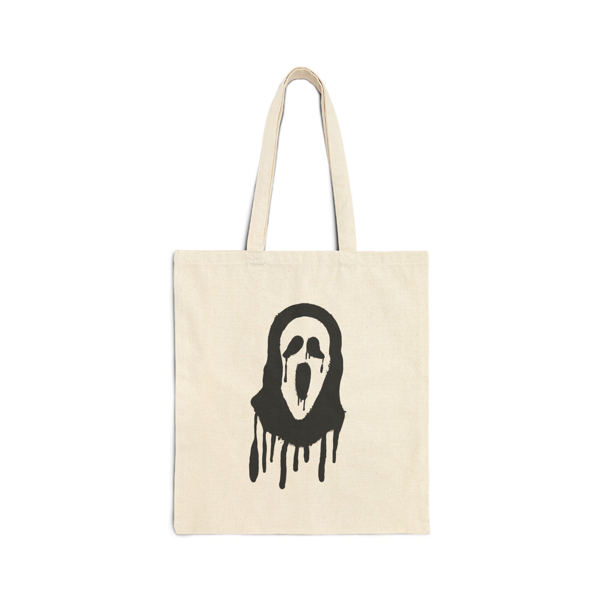 Hear the echo of the ghoulish season with our Halloween Scream Tote Bag. This chilling accessory is more than just a bag; it’s a statement that captures the essence of classic horror. Featuring a haunting, stylized screaming ghost-like face, this design has a dark, spray-paint finish with sinister drips that make it truly unique.