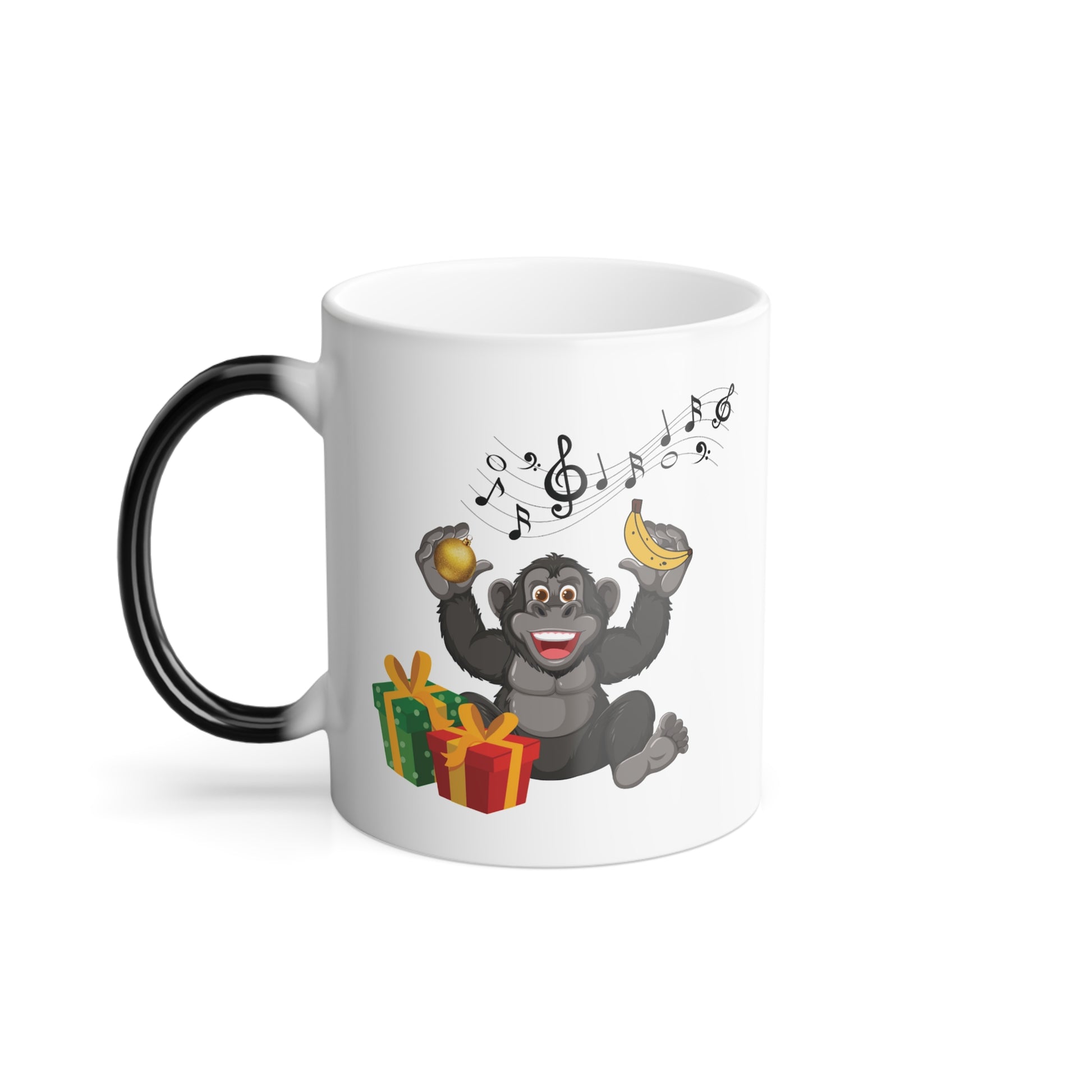 But listen up: the minute you fill it with that hot, morning brew or evening hot chocolate, the heat-reactive surface explodes with cheer! Ta-da! A super happy chimpanzee appears, gleefully juggling a golden ornament and a banana, with musical notes floating above its head and gifts stacked at its feet. It's an instant mood-booster!