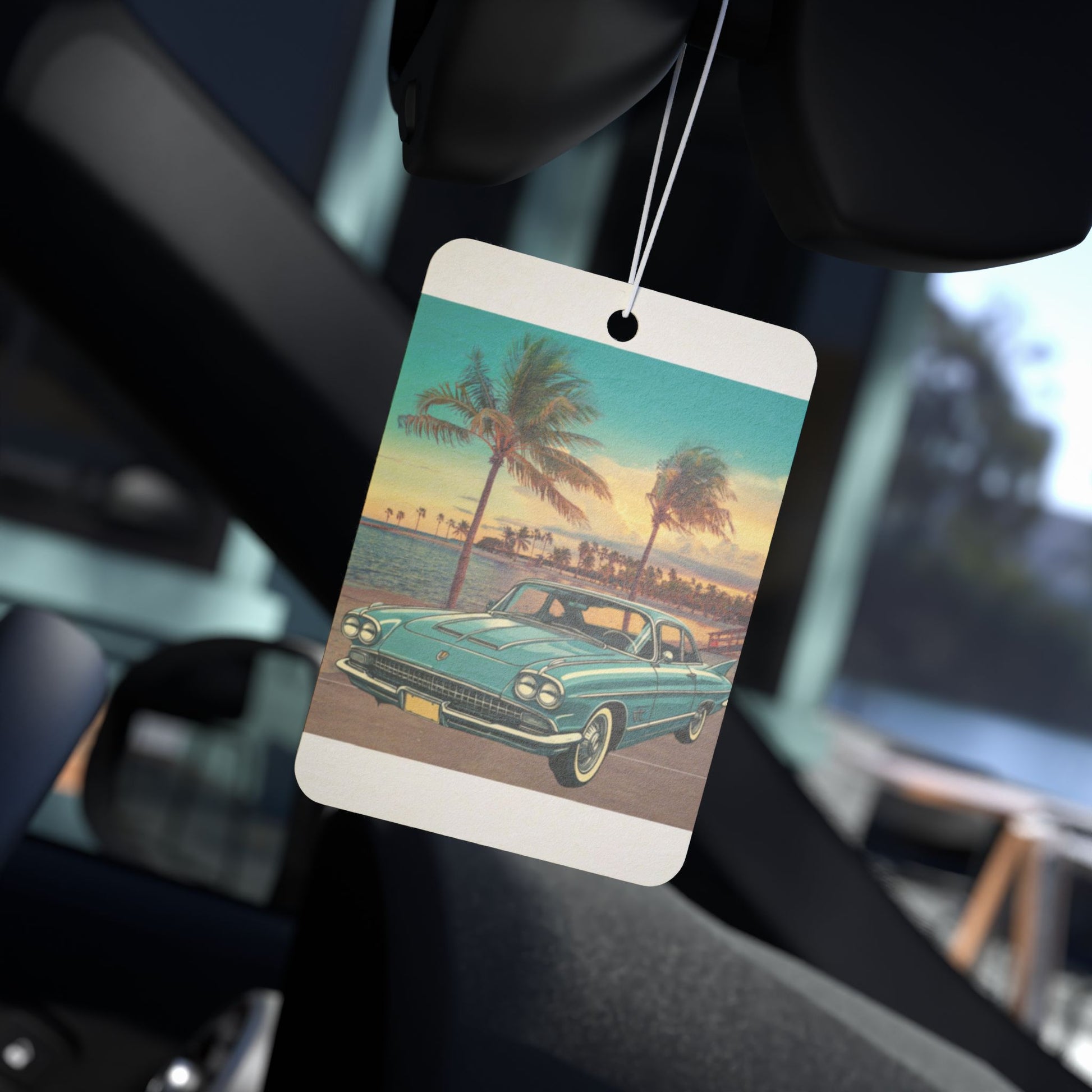 This exclusive air freshener design features a magnificent classic American car, a sleek, turquoise cruiser with unmistakable tailfins, parked against a stunning Miami Beach sunset backdrop. It perfectly embodies the glamorous, optimistic style of the Mid-Century Modern and Doo-Wop eras.
