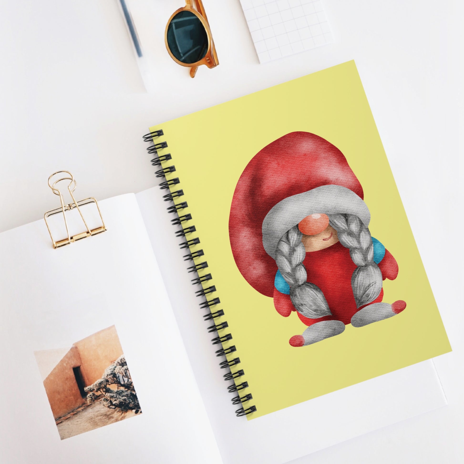 Meet our sweet Lady Gnome Spiral Notebook! The cover features an absolutely adorable watercolor illustration of a female gnome in a classic red suit and large matching hat, characterized by her charming gray braids tied with blue accents. This 118-page, ruled-line journal is the perfect companion for winter notes, daily journaling, or holiday gift tracking. The cozy gnome design adds a touch of warmth and whimsey to any desk or backpack.